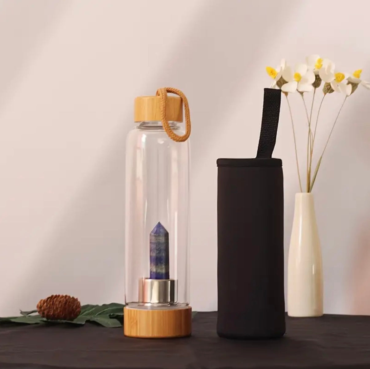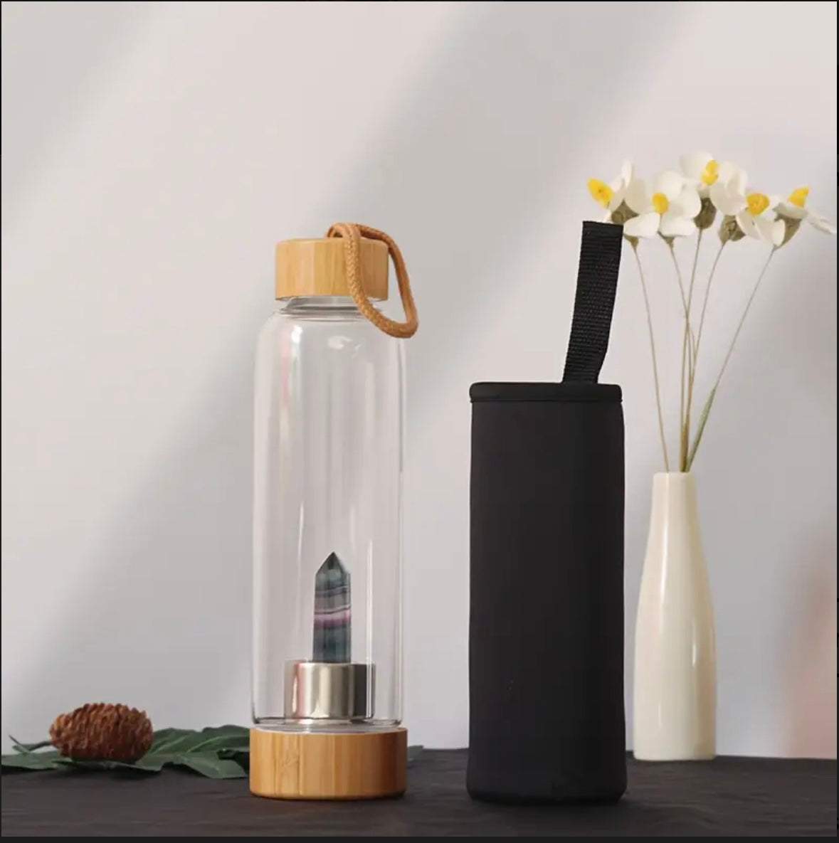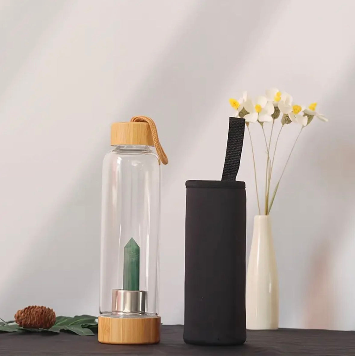Bouteille en verre et bambou avec pierre naturelle - Intention